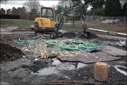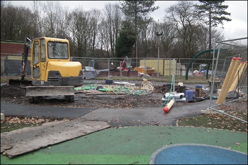 The play area’s new climbing frame and swings have made progress despite the bad weather with the new frame on site ready to be fitted. As you can see its like doing some Xmas puzzle trying to sort out all the bits for it.